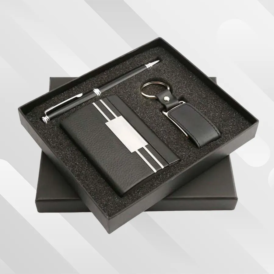 حامل بطاقة العمل مصنوع من الكروم عالي الجودة، وهو مصمم ليناسب حتى 100 بطاقة عمل. القلم مصنوع من المعدن الصلب، وله حبر أسود غني. قلادة المفاتيح مصنوعة من الجلد الطبيعي، وهي مثالية للحفاظ على مفتاحك في مكان آمن.